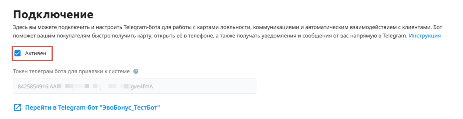 Шаг 2. Активируйте бота, поставить галочку в пункте “Активен”, вставьте токен полученный от @BotFather и нажмите "Сохранить". Если все сделано правильно, то отобразится сохраненный токен и ссылка на Telegram-бот.