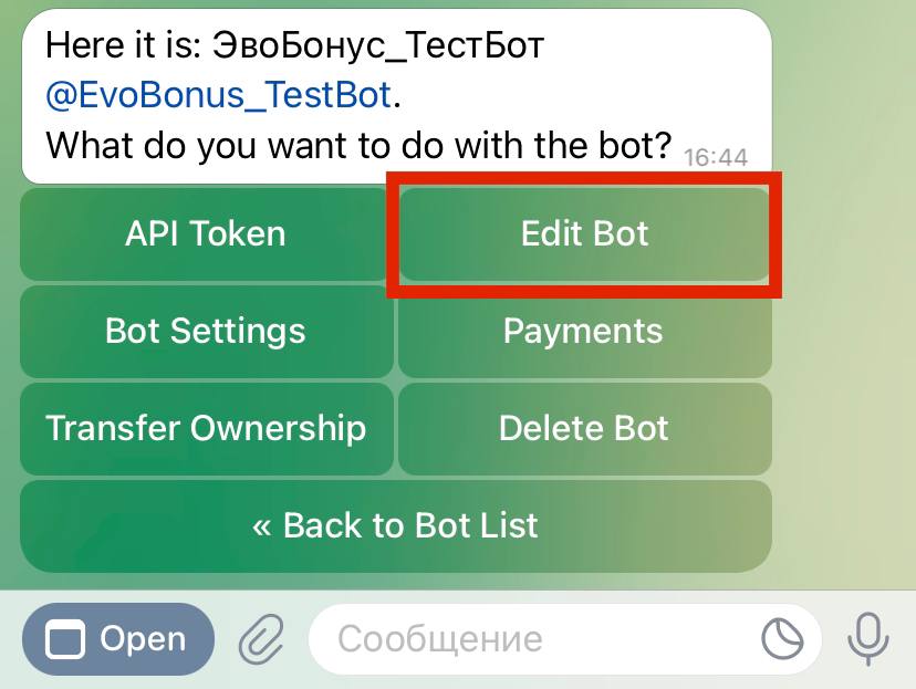 Для редактирования бота, нажмите кнопку «Edit Bot».