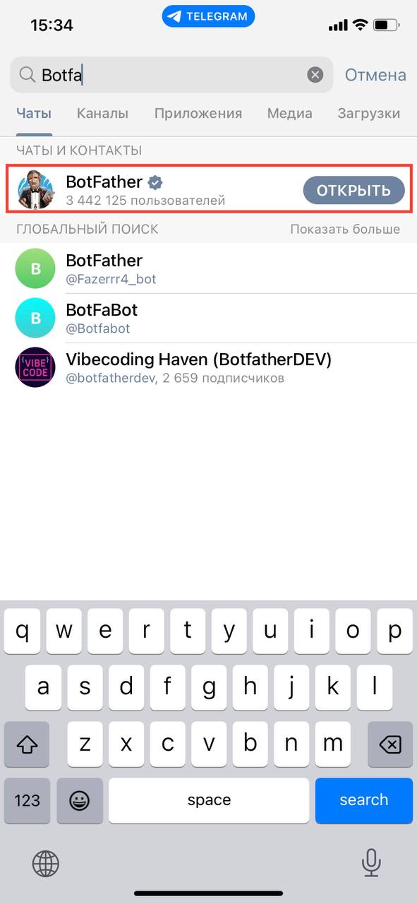 Шаг 1. Введите в поле поиска @BotFather и выберите бота. Либо пройдите по ссылке: t.me/BotFather. Обратите внимание, что у официального бота Telegram будет стоять синий подтверждающий знак возле имени в виде галочки.
