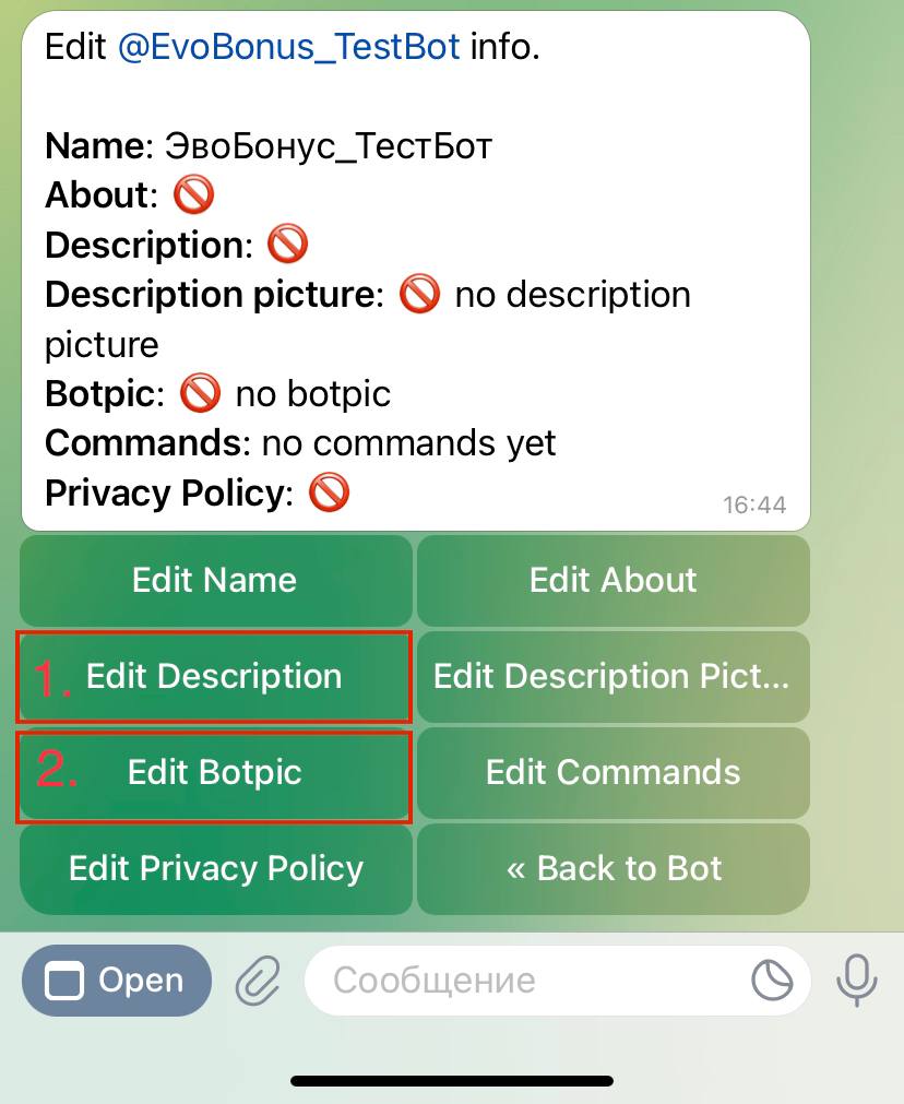 Шаг 7. Настройке «аватарку» (botpic) и описание бота (description), которые увидят ваши пользователи перед стартом чата с ботом. Для этого используйте команду /mybots и выберите бота для редактирования.