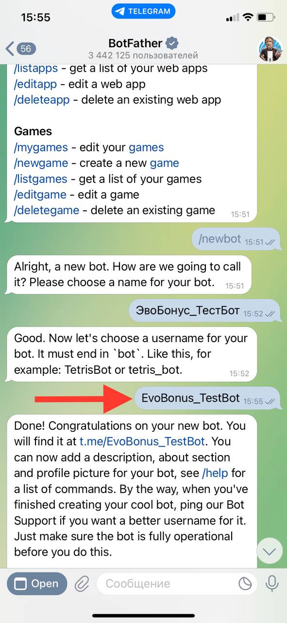 Шаг 5. Далее укажите никнейм бота — по нему можно будет найти бота в Telegram. Никнейм должен быть уникальным, не повторять существующие в базе и заканчиваться на слово «bot», без пробелов, можно использовать нижнее подчеркивание «_». Например, EvoBonus_Bot. После того как вы выберите подходящее имя бот будет создан.