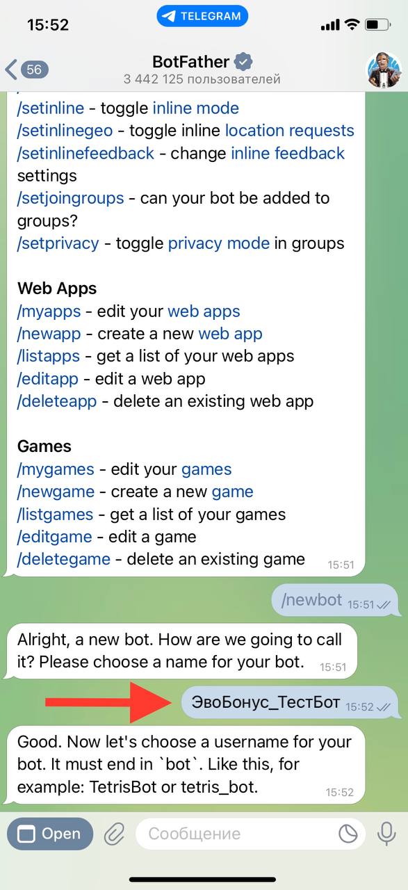 Шаг 4. Дайте имя боту — клиенты увидят это имя при общении с ботом, допустимо любое написание, включая русские буквы.