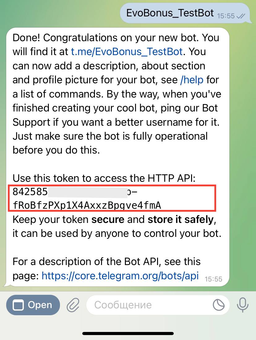 Шаг 6. Для подключения бота к ЭвоБонус вам понадобится токен. Скопируйте значение токена и сохраните его. На скриншоте токен выделен красным прямоугольником.