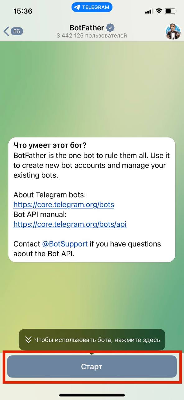 Шаг 2. Нажмите «Старт» для активации бота BotFather. В ответ вы получите список команд по управлению ботами